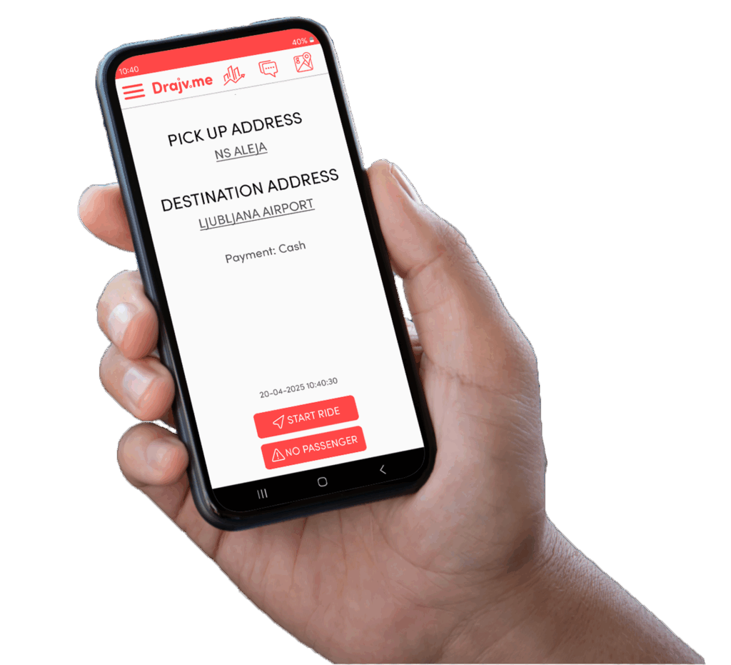 Aplikacioni Drajv.me Taxi të mundëson të porosisësh një taksi shpejt, lehtë dhe në mënyrë komode. Nuk ka më nevojë për telefonata të panevojshme apo pritje në linjë! Mjafton një klik dhe shoferi më i afërt do të vijë tek ti për vetëm disa minuta. Thjesht, shpejt dhe pa stres!